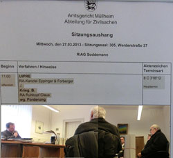 Überrascht war Richter Ralf Soddemann in dem Verfahren zweifellos, als ihm für das Krieg-Verfahren ein Gerichtsurteil eines Zimmermanns (17 O 649/05) vorgelegt wurde, um die Glaubwürdigkeit und Vertretungsvollmacht des UIPRE-Vertreters zu bestreiten. Vor dem Prozess hatte auch der Schweizer Geheimdienstler und Bullshit Detector G. J. Wasser, Kriegs iepa-Vorstandskollege in den Verfahrensablauf eingegriffen. Er verlangte unter Hinweis auf eines von vielen Zimmermann-Verfahren vom UIPRE-Vizepräsidenten M. Aigner eine eidesstattliche Erklärung gegen den gewählten UIPRE-Vertreter, dem anderenfalls Sanktionen bei Grenzüberschreitung gegenüber stehen könnten. Soddemann hat zum Verfahrensende ausdrücklich darauf hingewiesen, dass UIPRE nach BGB-Grundlagen einzig von dem gewählten GF-Vorstand R. G. Lehmann vertreten wird. Vertretungsbestreitungen, Entlassungen oder gar Auflösungen (Benes-Dekret) könne es ohne die Zu- und Abstimmung der internationalen Journalisten-Mitglieder gar nicht geben. UIPRE müsse auch keine Beschädigungen des Mitgliedsvermögen hinnehmen. Ob dies in früheren Amtszeiten von Starke und Krieg gang und gäbe gewesen wäre, sei irrelevant, die Hinnahme von Rechtsbruch kann Krieg nicht als Gewohnheitsrecht reklamieren. Wie Polizeien und Rechtsbehörden in der EU die deliktische und gesellschaftspolitische Beeinflussung und Ausforschung von Presse, Medien und Elektronik-Branche oder die Ausforschungs-Hilfereichungen von angeblichen Journalisten bis zur komplexen Industrieelektronik, Waffen- und Atomszene bewerten, ist nicht Angelegenheit des IFPA-Awards und erst recht nicht seines Gastgebers. Der Gastgeber steht andererseits auch im 25. Jahr für die Kultur der Marktförderung durch Marktqualifizierung. Dazu gehört zwingend Vertrauen, Vertraulichkeit und die notwendige Klarheit, dass sich jeder ein Bild ohne inszenierte Wirklichkeit machen kann.