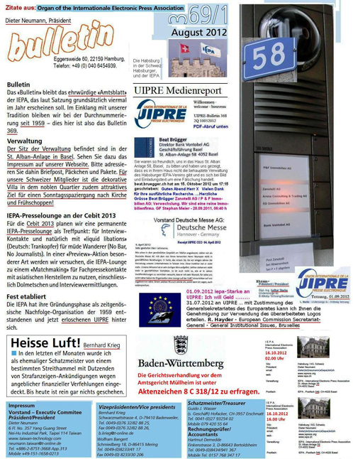 In einem Rundschreiben „iepa-Vorstand“ hatten die Ex-Journalisten Bernhard Krieg und Dieter Neumann als Vorstände für den iepa-Verein Medienverkehrskreise – darunter viele Corporate Media-Einreicher – in drohender und diffamierender Form vor der Teilnahme an der Preisverleihung des IFPA-Award gewarnt. Die Entnahme von Daten und Adressen aus Arbeitscomputern wird vermutet. Die Corporate Media-Veranstalter sollten die IFPA-Preisverleihung parallel zu 24. Corporate Media absagen. Preisträgern wurde von der Teilnahme an der Preisverleihung 2012 abgeraten. Der Vorgang wurde zur zivil- und strafrechtlichen Würdigung unter Hinzuziehung der Recherche-Daten zum IFPA-Award abgegeben. Eine Rolle spielen dabei alte UIPRE-Bankbeziehungen. Geldschiebereien, die deliktische UIPRE-Netzabschaltung und die Weigerung der Datenoffenlegung u.a. durch die Credit Suisse gegenüber ihrem eigenen neuen Kontoinhaber-Vertreter. Dieser Forderung ist die Rechtsabteilung der Postfinance Bern nachgekommen. Damit wurde die Urkundenfälschung von Bernhard Krieg bekannt, der sich am 11.11.2011 als UIPRE-Vizepräsident ausgab. Der angebliche internationale Habsburger Presseverein wird angeblich von der Adresse der Baseler Vontobel-Bank und der Zanotelli-Firmen und Beteiligungen aus vertreten. Tatsächlich liegen die Wohnorte der meisten Verantwortlichen in Deutschland und der Schweiz. Der Schweizer Bullshit Detector Wasser, Schweizer Spezialist für geheime Operationen und neue Waffentechnologien, verlangte vom UIPRE-Vizepräsidenten Markus Aigner am 28.12.2012 eine eidesstattliche Erklärung zur Vorlage bei einem Prozess gegen Krieg (AG Müllheim 8 C 318/12). Dem Gericht wurden vom Beklagten Bernhard Krieg Daten, Informationen und eine Urteilskopie aus 649/05 des Günter Zimmermann vorgelegt. Zimmermann, heute Beiratsvorsitzender einer Karlheinz Wolfgang Stiftung, (Nachfolger VIPE e.V., Neuss) hat sich 2005 an den abgelösten UIPRE-Vorstand Lothar Starke herangemacht hat. Seine Daten und angeblich inzwischen weitere rund 1.000 zugespielte Mails und Korrespondenzen besitzen und verwenden nach eigenen Angaben iepa-Vorstände. Ein internationaler Missbrauch ist nicht auszuschließen. Nach Angaben von iepa-Mitglied Michael Wilke, Rösrath, Dienstleister für G. J. Wasser und Registrant von Kriegs iepress, steht sein „attestor“ für einen riesigen Datenfundus. Den Besitz eines großen Spezial-Datenfundus hat 2007 auch die Geschäftspartnerin von Günter Zimmermann und Karlheinz Wolfgang, Ulrike Kruse, Meerbusch, für deren Netzwerk behauptet. Dem Netzwerk, von dem sich 2005 der FdM e.V. distanziert hat. Dokumentationen unter / please go to here: