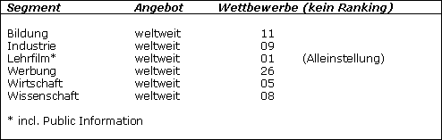 Das internationale Relevanz-Profil gibt Auskunft, für welche Themen der unabhängige Meisterwettbewerb Corporate Media steht und wie viele weltweite andere Optionen es gibt. Medien- und Filmbewertungen zu unterschiedlichen Nomenklaturen gibt es beispielsweise in Abu Dhabi, Adelaide, Buenos Aires, Chicago, Eriwan, Hanoi, Hollywood, Istanbul, Jerusalem, Kiew, Montreal, Moskau, Las Vegas, New York, Sao Paolo, Seoul, Sydney, Tokio, Vancouver – und Tegernsee (Festival der Bergfilme). Obwohl die sonst bekannten und berücksichtigten Detaildaten diesmal nicht in die Beschreibung flossen, ist folgendes Corporate Media-Profil im weltweiten Kontext zu erfahren: